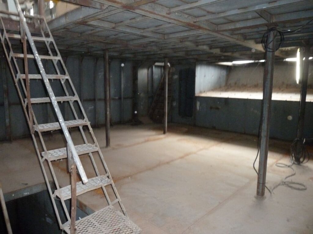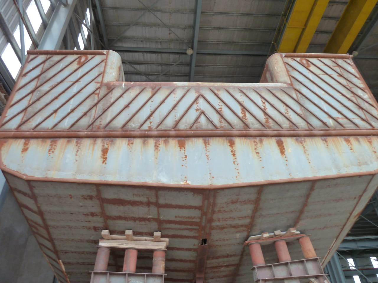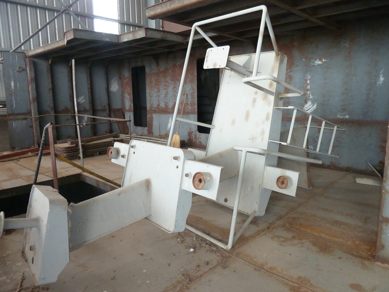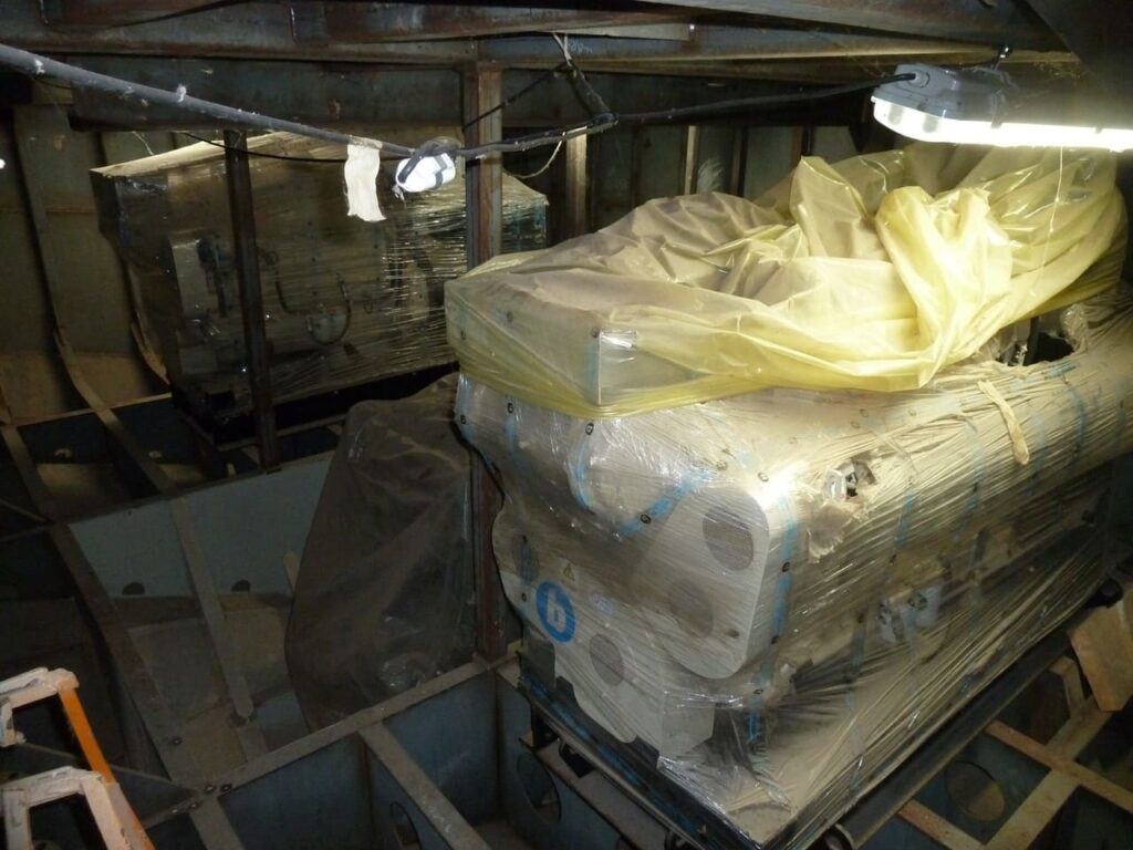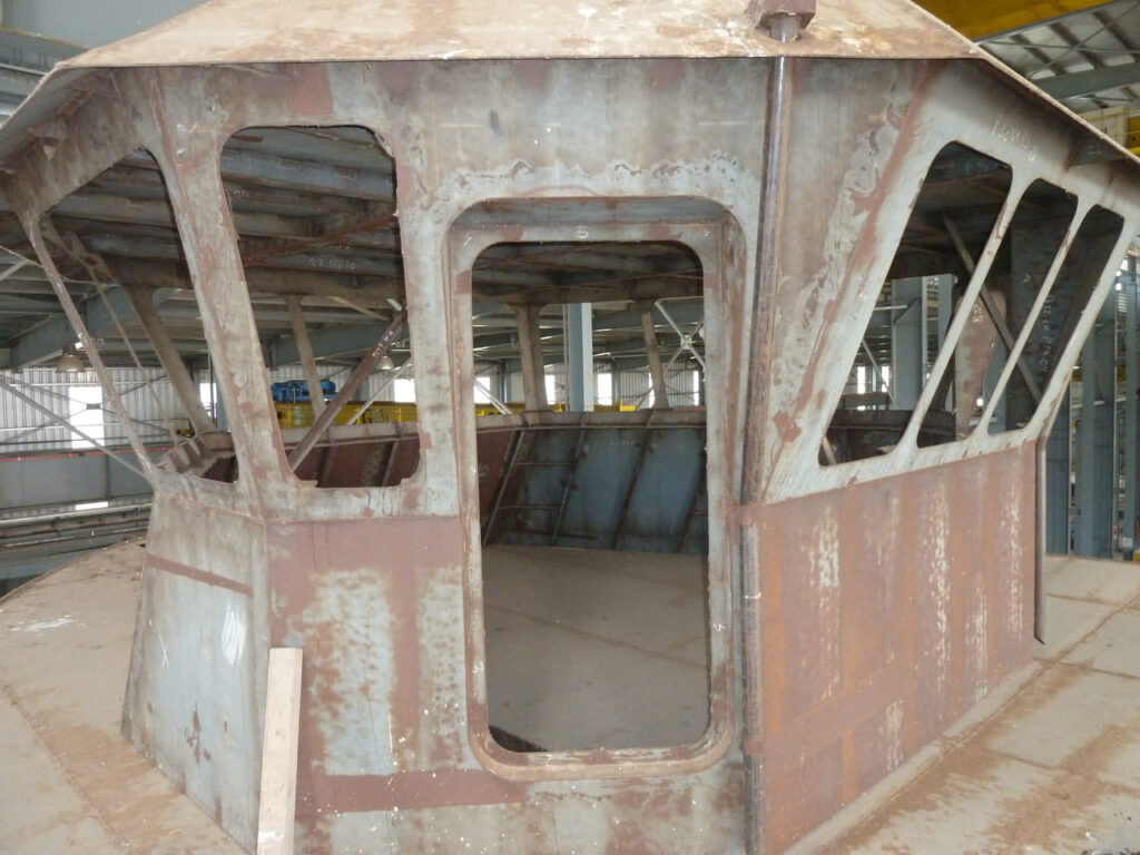 La estructura del casco está montada en un 85%, todos los bloques se encuentran prefabricados al 100%. En sala de máquinas se disponen el motor principal, su caja reductora y los auxiliares. El generador de puerto también se encuentra montado en su correspondiente local. Se encuentran dispuestas las tuberías de combustible y achique que atraviesan tanques doble fondos.